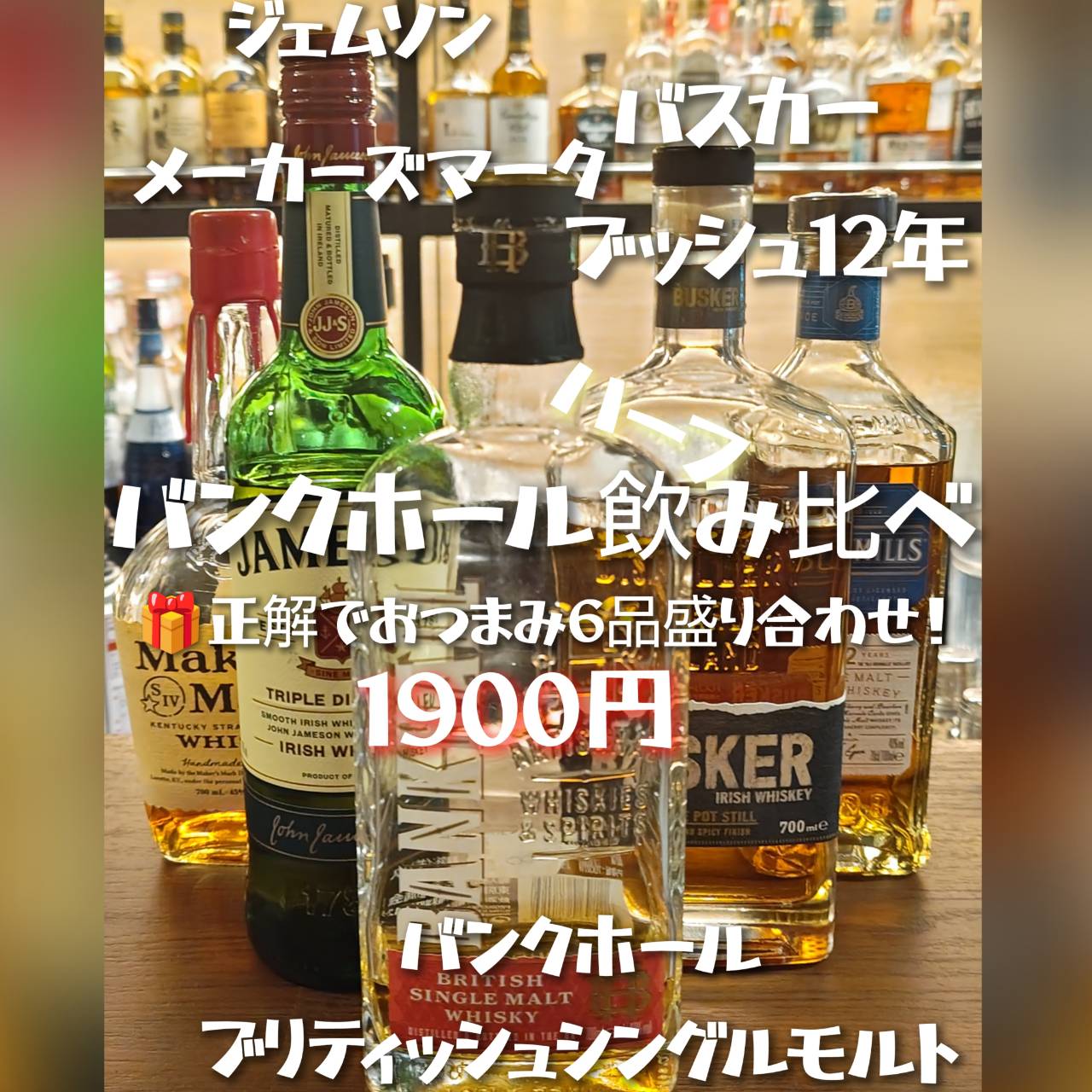 『滑らかなトリプル蒸留、甘く香ばしい新樽熟成、そしてブリティッシュ・モルトらしいクリーンさ、そんなバンクホールの魅力を世界の個性派ウイスキーたちと徹底比較!銘柄を推測🔍し全て正解の場合、おつまみ6品盛り合わせをプレゼントする「ブラインドテイスティング」🎲も実施しています🎉。』