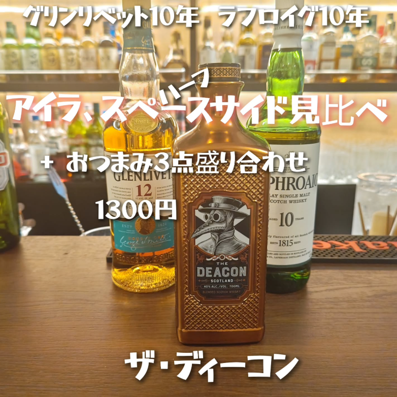 各ウイスキーをハーフで飲み比べておつまみ3点盛り合わせをサービスして1300円で提供させていただきます! 『ザ・ディーコンをより深く味わうためには、「ラフロイグ 10年」と「グレンリベット 10年」の飲み比べがおすすめです。 この飲み比べで、ザ・ディ... -